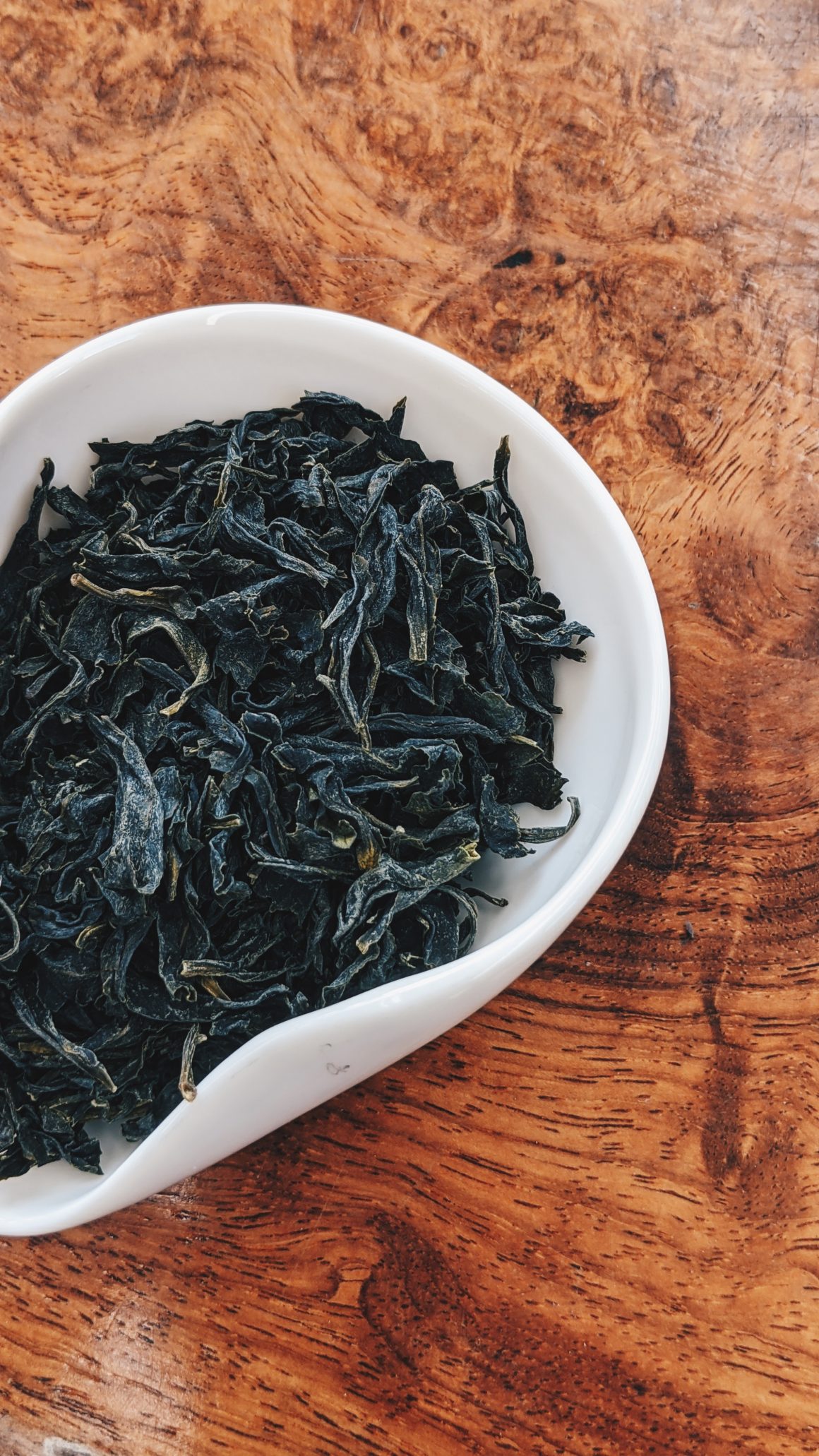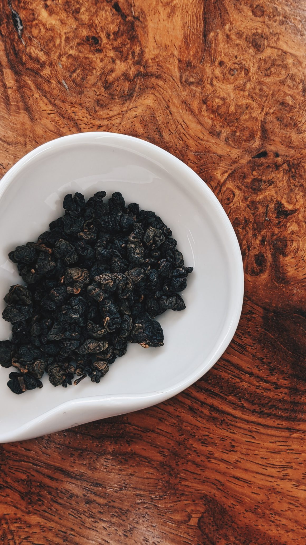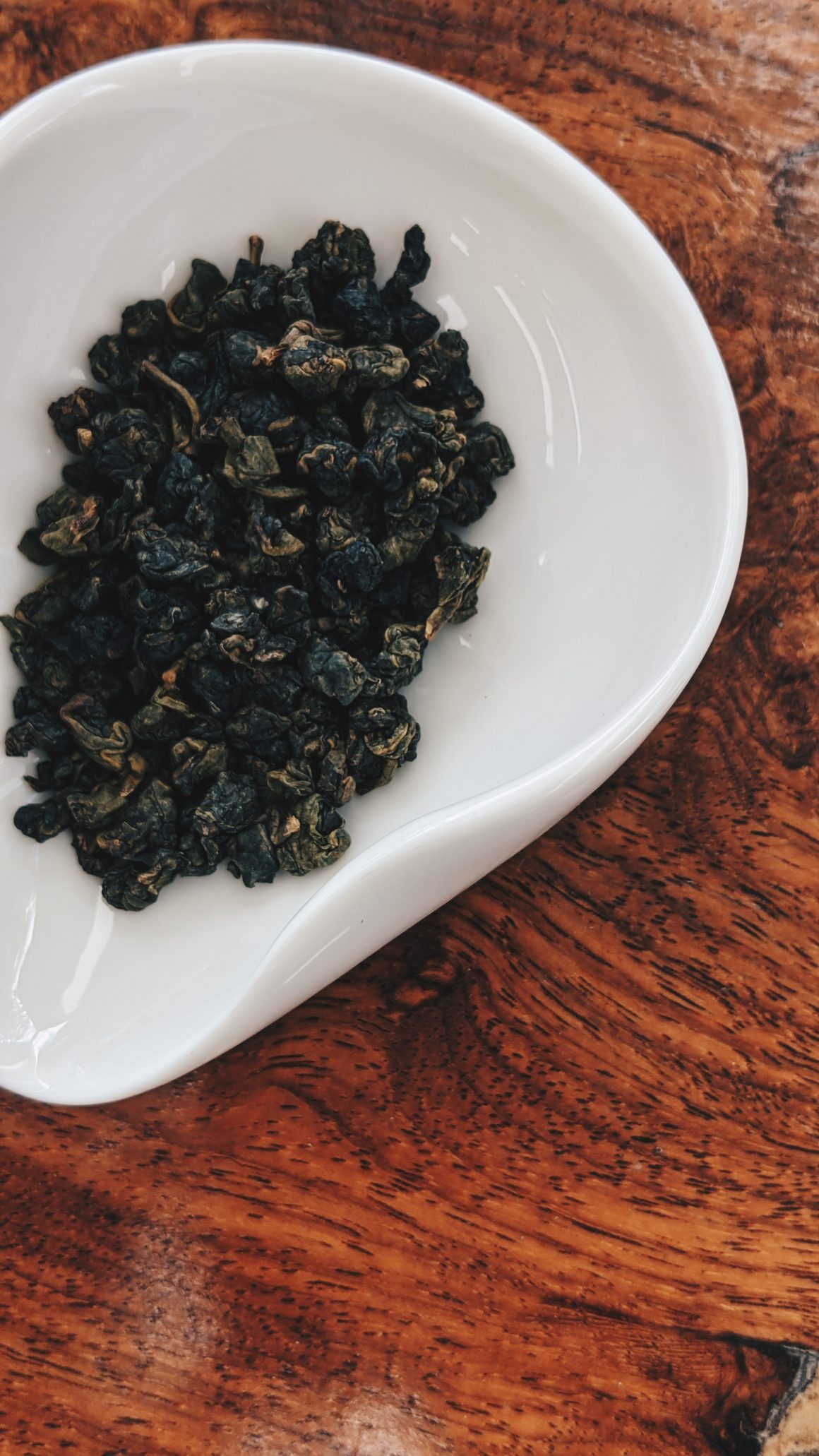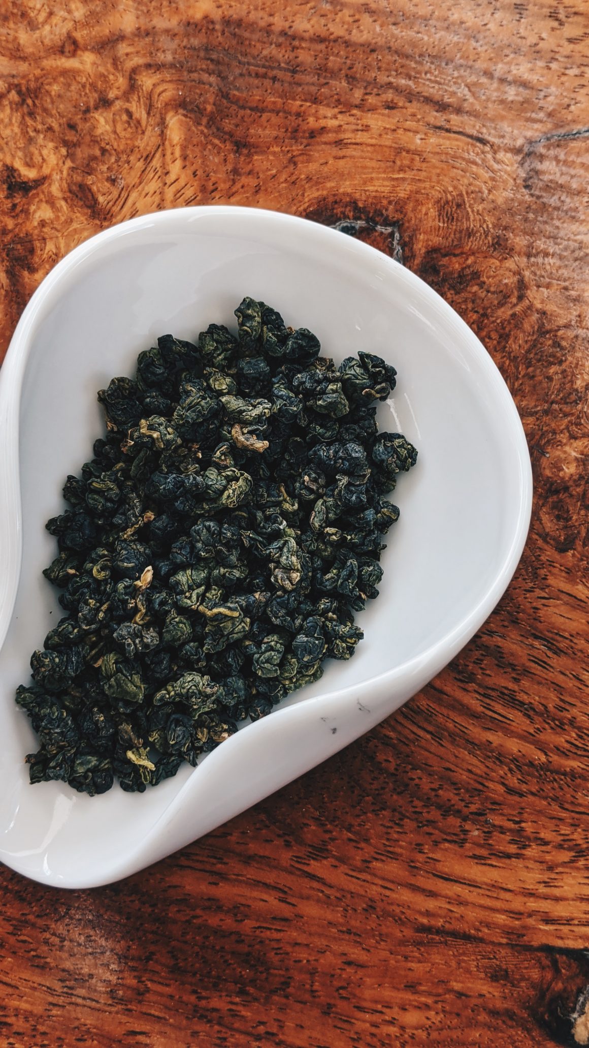 The tea in 3 stages, from fresh camelia lives, to oolong ball, to unfurled tea from the pot. Each serving of Zealong tea is designed to be brewed multiple times throughout the day as the leaves continue to rehydrate.